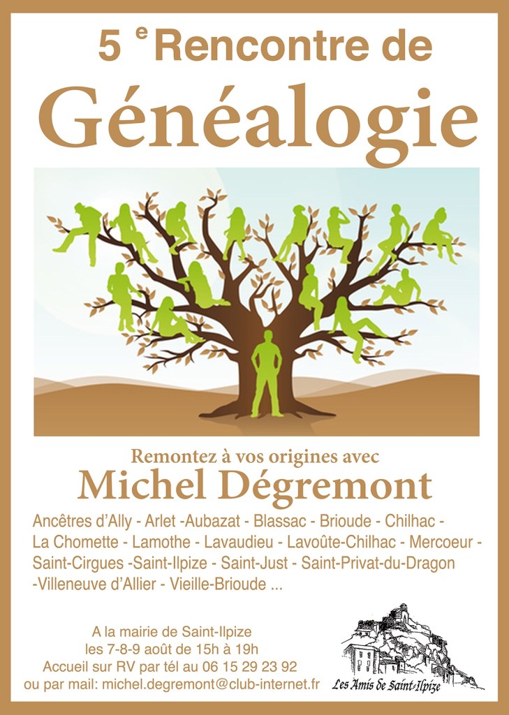 Pour la cinquième année consécutive, venez à la rencontre de Michel Dégremont et avec lui remontez le temps sur les traces de vos aïeux de la vallée de la Ribeyre. Apportez avec vous le maximum d’informations pour que Michel, passionné de généalogie, vous donne les réponses que vous cherchez et parfois même celles que vous n’attendiez pas. La rencontre aura lieu les 7, 8 et 9 août prochains de 15h00 à 19h00 dans la salle du conseil de la mairie de Saint-Ilpize.